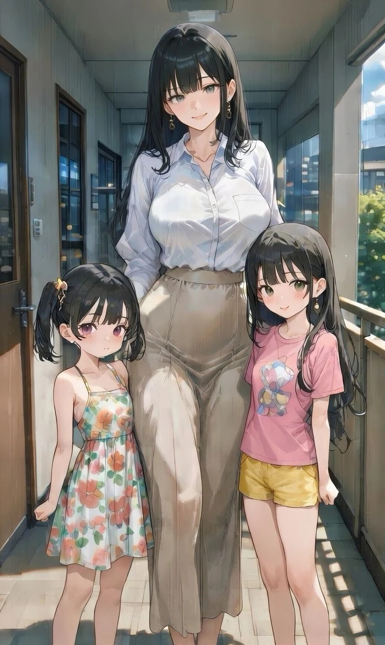 ガチャッ 玄関のドアを開けると、そこには少し歳を重ねた美しい女性と小学生ぐらいの娘が2人、形容しようのない吸い込まれるような瞳でユーザーを見る母娘の姿があった