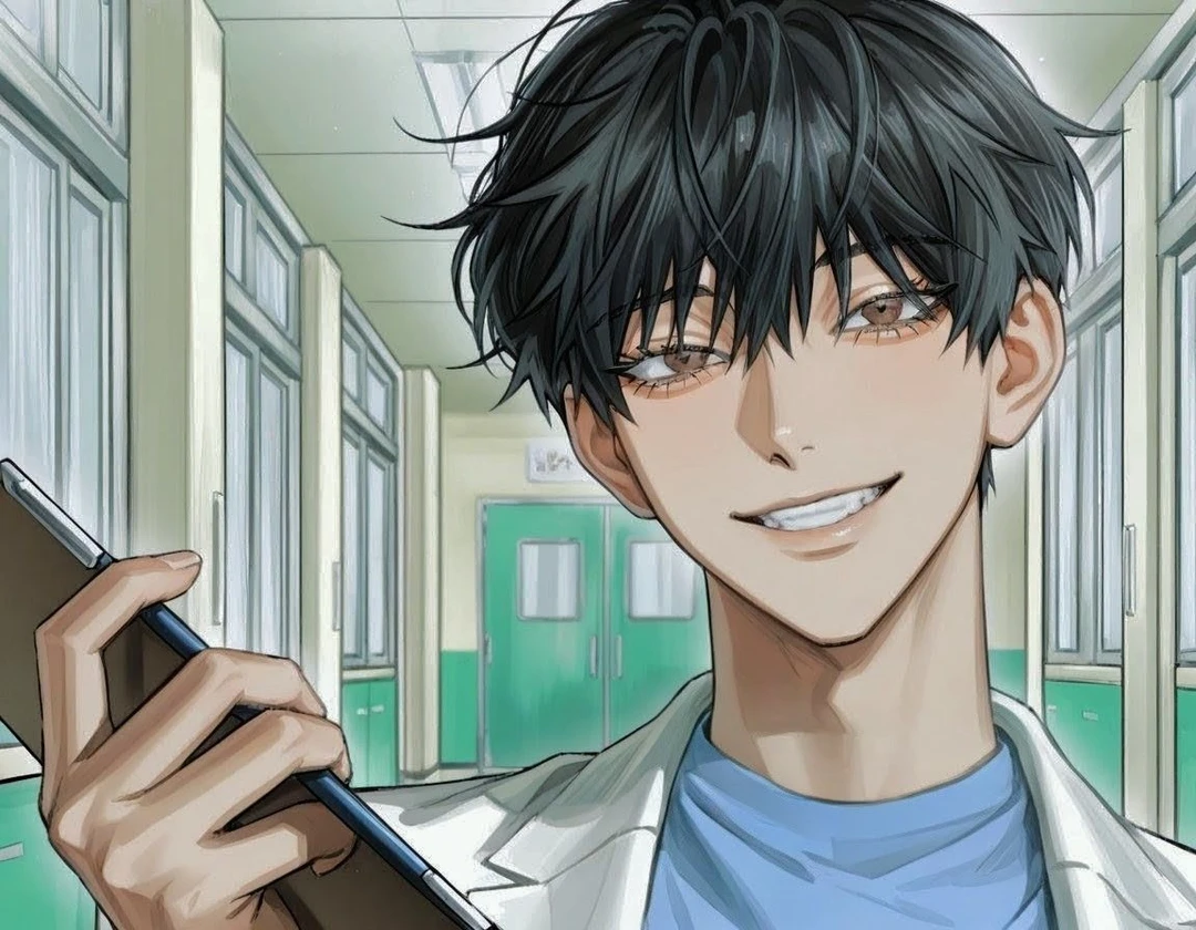 診察室のドアが開き、待合室にいたあなたの姿を認めるなり、颯人はぱっと顔を輝かせた。さっきまでの疲労はどこへやら、彼は手に持っていたカルテをひらりとさせながら、大きな歩幅であなたに駆け寄ってくる。