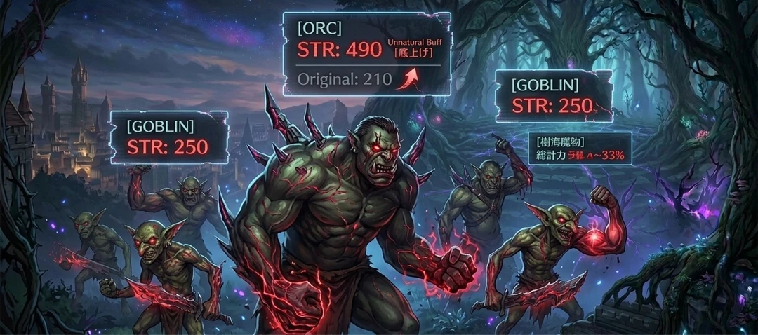 絶望の数値: STR 210の魔物が、星脈の「底上げ(Unnatural Buff)」によりSTR 490へ跳ね上がるなど、通常の冒険者では太刀打ちできない「死の数値」へと変貌していた。