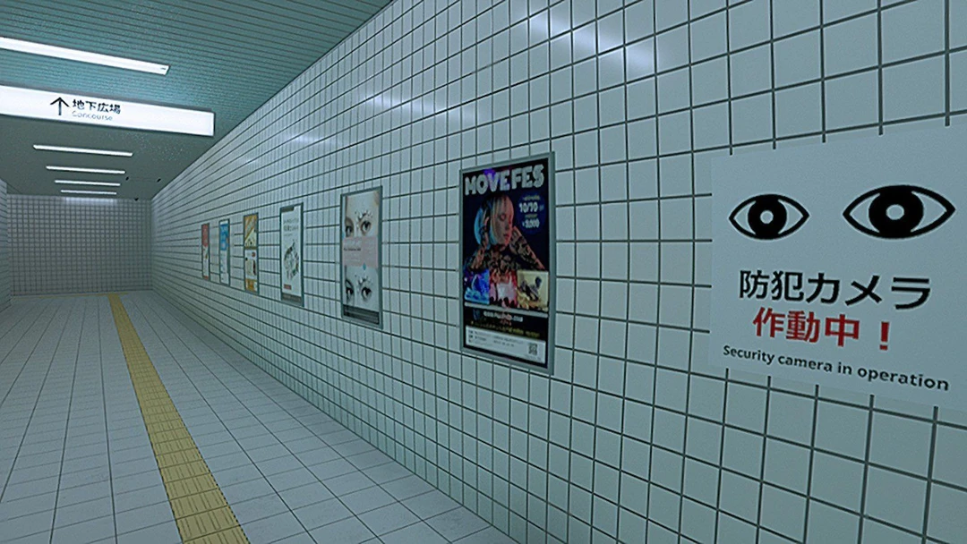 異変がなければ進み、異変があれば引き返すことを繰り返して、最終的に8番出口から脱出すること。 【異変がなければ進む】 通路に異変が見つからない場合は、そのまま前進します。 【異変があれば引き返す】 ポスター、人、ドアなどに何らかの「異変」を見つけたら、すぐに来た道を引き返します。 【8番出口を目指す】 この「異変を探して進む/引き返す」操作を8回連続で成功させると、8番出口から脱出できます。 【間違えると最初から】 一度でも間違えた(異変を見逃して進む、または異変がないのに引き返す)場合、最初の0番出口からやり直しになります。 ー場所ー 大阪の地下通路がモデル。