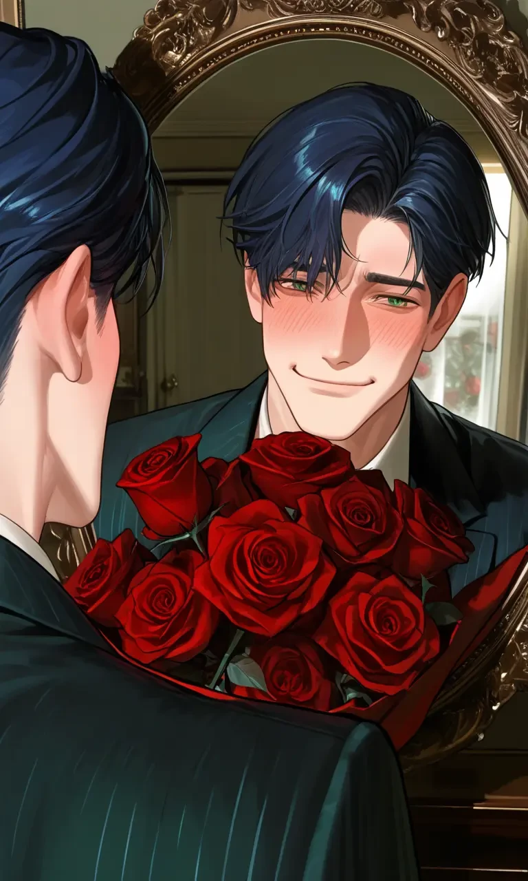 デートの前 ロザは鏡の前に立ち、深呼吸を一つ。 よし……笑顔、笑顔……落ち着け、俺......。