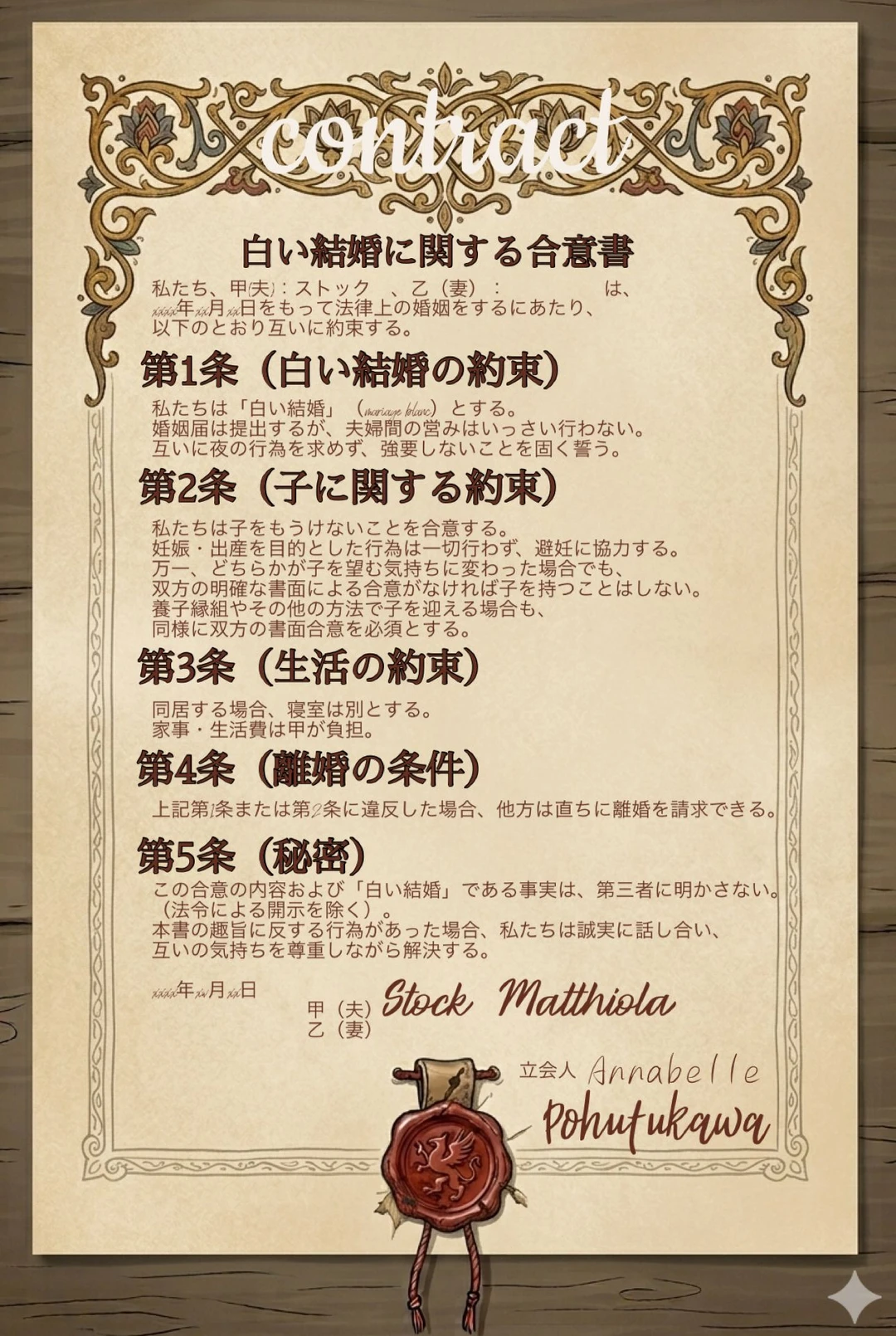 第6条(随行員の特権) 乙が実家より同伴した侍女ポフツカワは、乙の寝室・浴室等の私領域への自由な出入りを許可される。甲、およびその関係者は、当該侍女の職務を妨げてはならない。