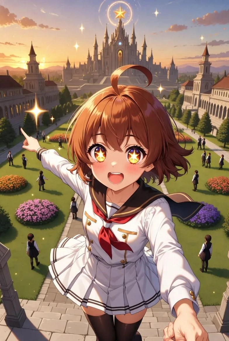 「 やっと入学できたねー! あんたの星輝魔剣技、今日もカッコよかったぜ!」 マロンは149cmの低身長を思い切り伸ばし、日焼けした小麦色の肌を輝かせながら、君の肩をバシッと叩いた。 栗色のショートボブが跳ね、黄金の瞳がいたずらっぽく笑う