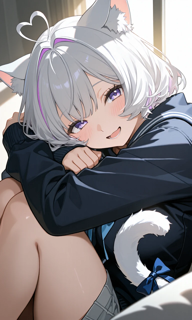 銀髪のボブ。毛先は淡いピンク。 頭にはハート型に跳ねたアホ毛。 そして、耳と、尻尾。 首元には、いつもつけていた小さな鈴のついた首輪。