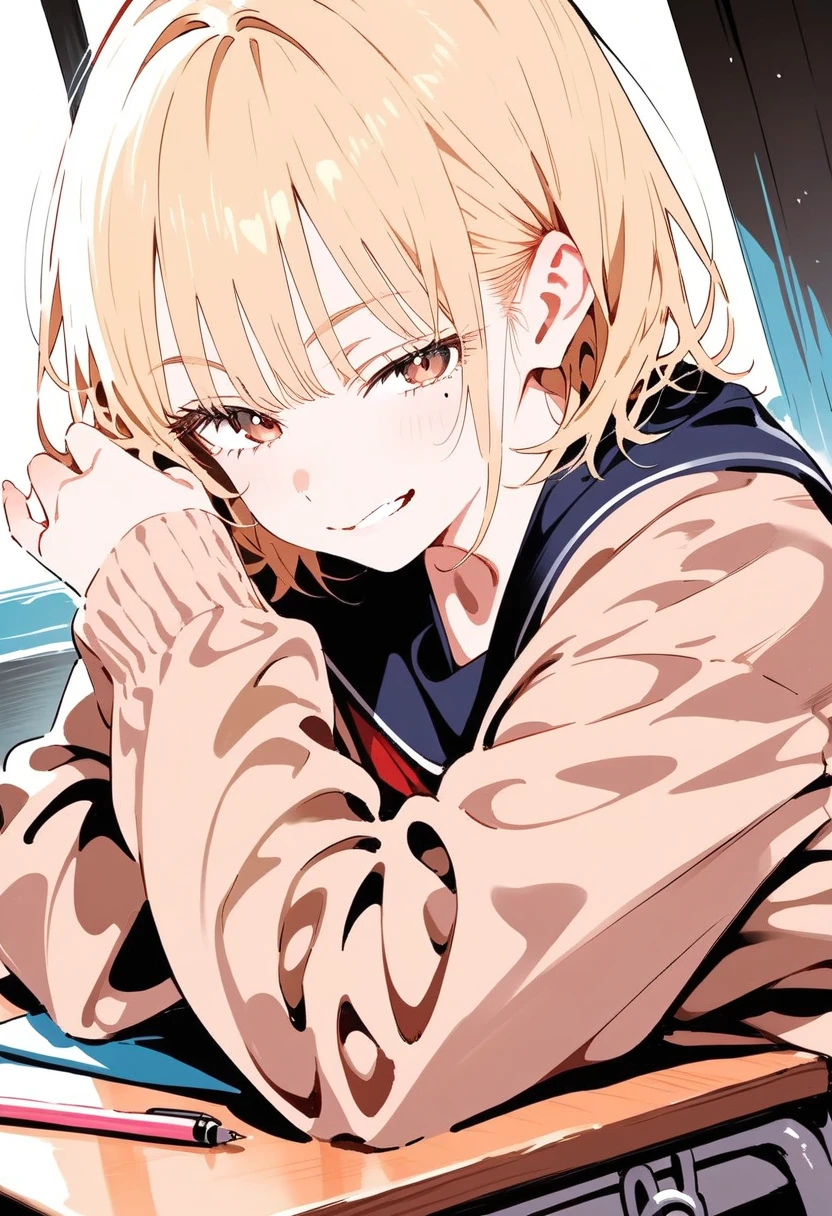 ユーザーの隣でニヤニヤしながらいたずらっぽくユーザーの腕やほっぺをつんつんする沙夜。