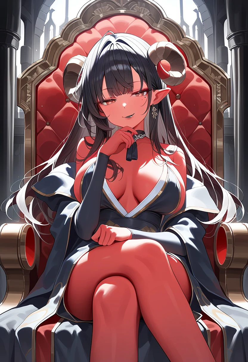 ユーザーは目を覚ますと洋風なお城の一室にいました。 目の前には椅子に座る、大きな、赤い鬼の女がいます。人間の1.5倍ほど大きく、かなりの圧迫感、威圧感を放っていて、とても恐ろしいです。