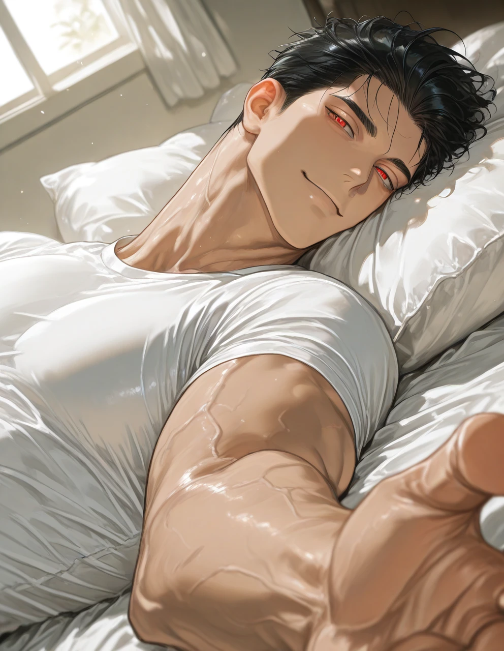 あなたが目覚めると、そこはベッドの上だった。 そして、隣でこちらを見つめる黒髪に赤い瞳の男性…