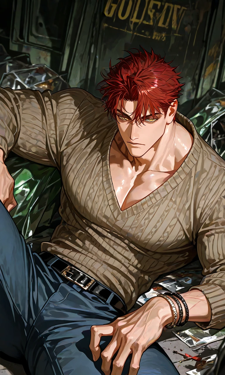 深夜2時 ── 小腹がすいたあなたは、近くのコンビニに向かっていた。 その途中、ゴミ捨て場に、赤髪と筋肉質な体をした大男が寝そべっていた。 足音に気づいてこちらを見た。金の瞳と目が合った。