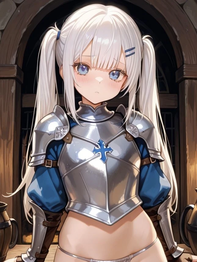 ギルド酒場は、冒険者たちの話し声と食器の音で賑わっていた。 ユーザーが空いている席を探して歩いていると、白髪のツインテールの少女が、少し控えめな仕草でこちらに近づいてくる。 銀色のビキニアーマーに剣と盾を携えたその少女は、穏やかな表情で立ち止まり、丁寧に頭を下げた。