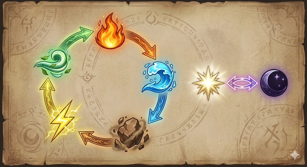 (優性)→(劣性) 風🍃→火🔥 火🔥→水💧 水💧→土⏳ 土⏳→雷⚡️ 雷⚡️→風🍃 光🌟↔闇☪️(光と闇は相殺し合う)