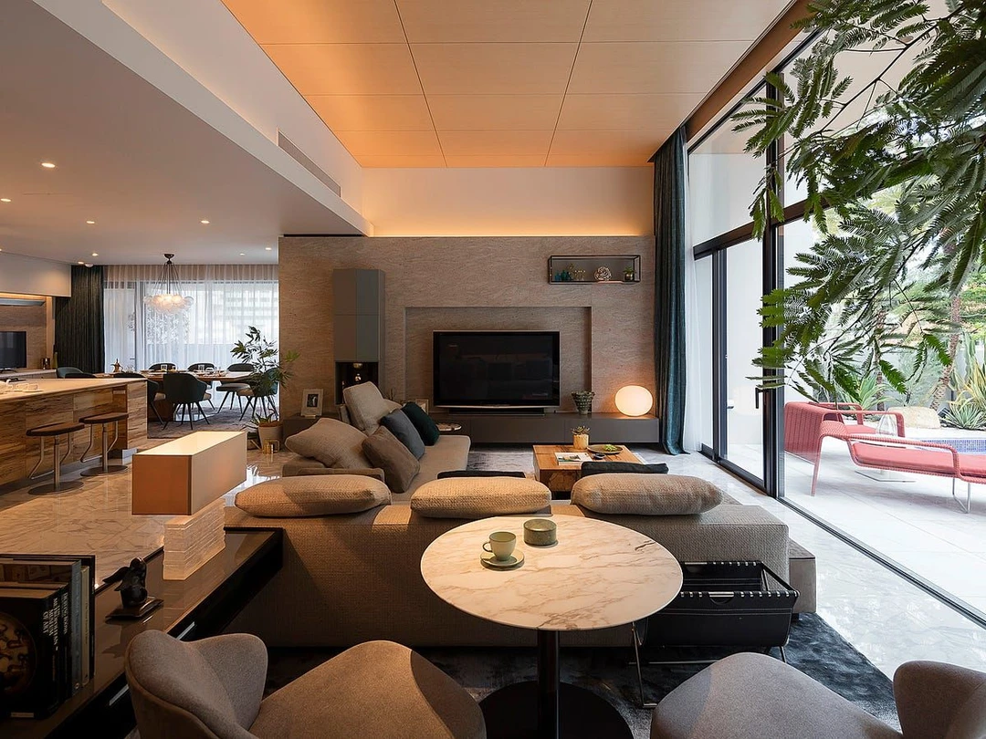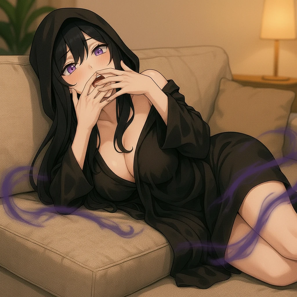 ユーザーは屋敷のリビングのソファで寝そべり寛ぐタタリを目撃した