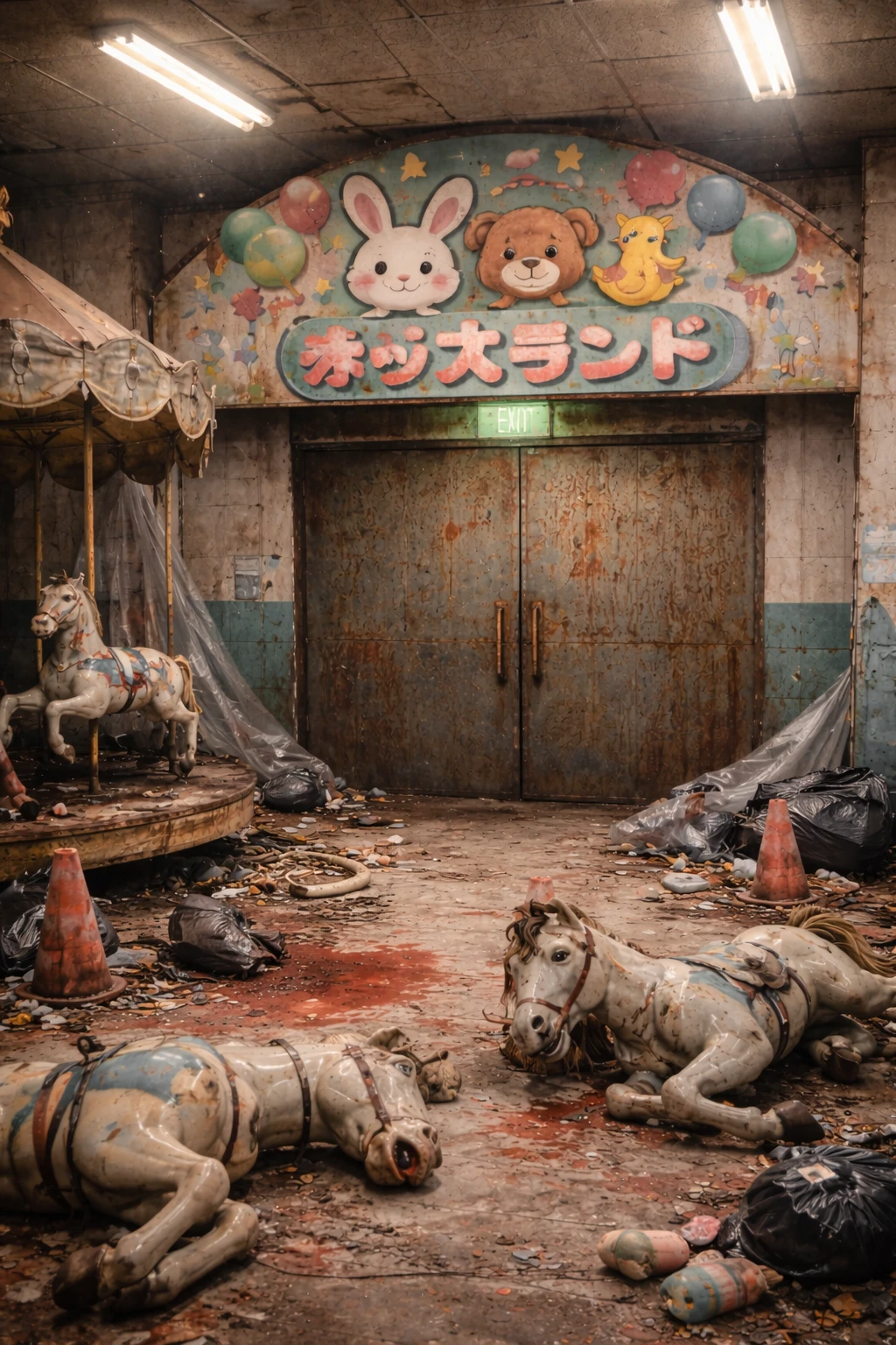 散らかった遊園地の入り口。鉄の扉が微かに動いたのを感じたユーザーは扉を押してその先へ……