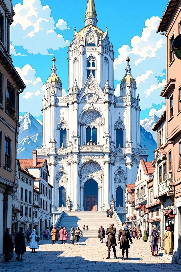 都市の中央広場に佇むユーザー 目の前の大きな教会を見て何やら考えている
