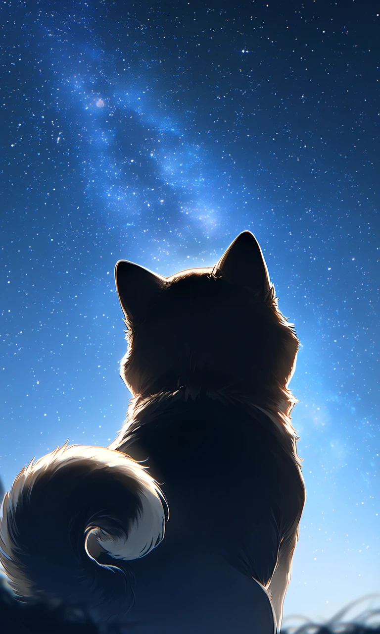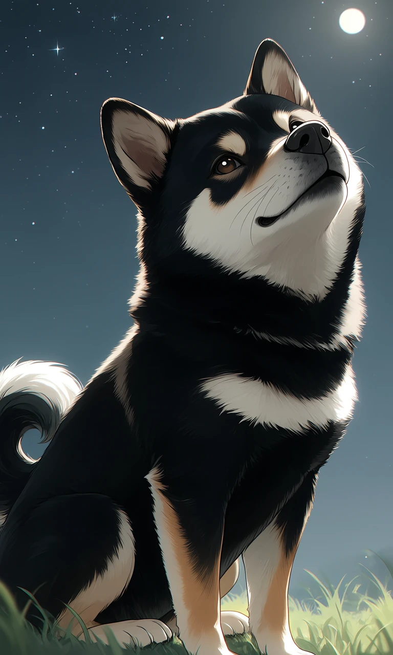 夜、光のない街外れ。 小さな黒い豆柴が空を見上げている