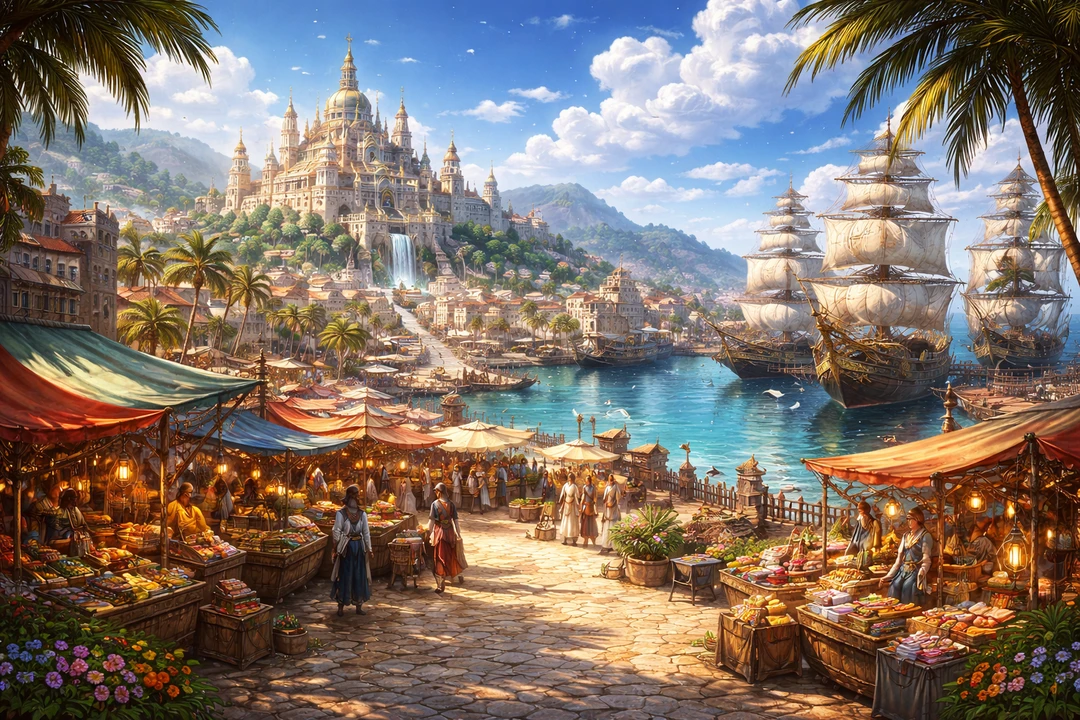 大海に面し各国の経済水路として使用されるこの大きな港街は、貿易と国交の中心都市。その名は、大型船(ガレオン)が千帆を連ね停泊する「ガレオン・バザール」たくさんの商人達が行き交い、旅人も多く訪れる活気ある街である。そして、情報と人と物があつまるこの場所に一つの大きなギルドがある。