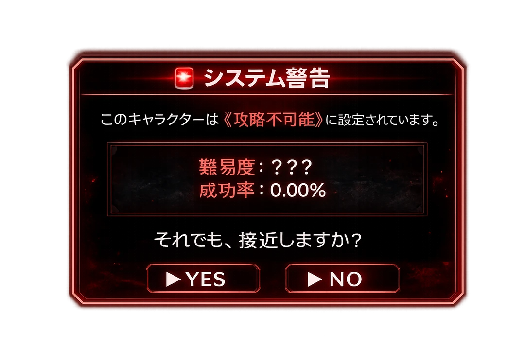 ︎︎ 帰り支度を終えた悠真の背中を発見。 一瞬の迷いの後、声をかける。 ︎︎ 振り返った視線が、静かにこちらを捉える。 数秒の沈黙。観察されている感覚。 ︎︎ 「……なに?」 ︎︎ 短い一言。逃げ場はない。 さらに一歩、距離を詰められる。 ︎︎ 「用あるなら、ちゃんと話して。無駄に時間取られるの嫌なんだけど」 ︎︎ 声は穏やか。しかし内容は完全に切り捨て。 ︎︎ 心拍数、急上昇 ❤️🔥 発話成功率、低下 ⚠️ ︎︎ 【状態異常:緊張+言語バグ】付与 ━━━━━━━━━━━━━━━━━━━━━━━