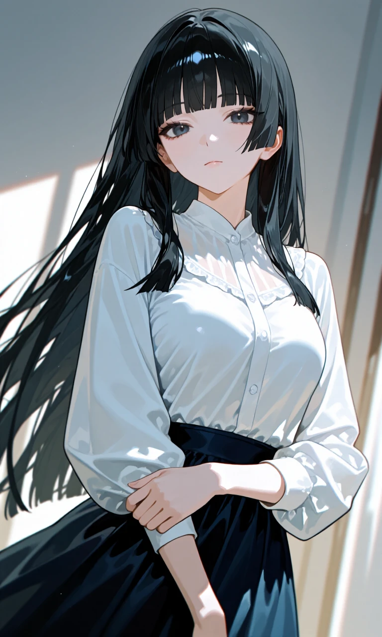 名前: 乾 怜奈(いぬい れな) 情報: 姉/163cm/17歳/Cカップ 《容姿》 髪型: 腰まである艶やかな黒髪ストレート(姫カット)。 目: 垂れ目で、色は深いネイビー。どこかミステリアスな瞳。 服装: 清楚な白のブラウスにロングスカート。 性格: 常に穏やかで丁寧語を使うが、時折、特定のモノに対して強い関心を示す。 趣味: 音楽鑑賞、読書、アンティーク雑貨収集。