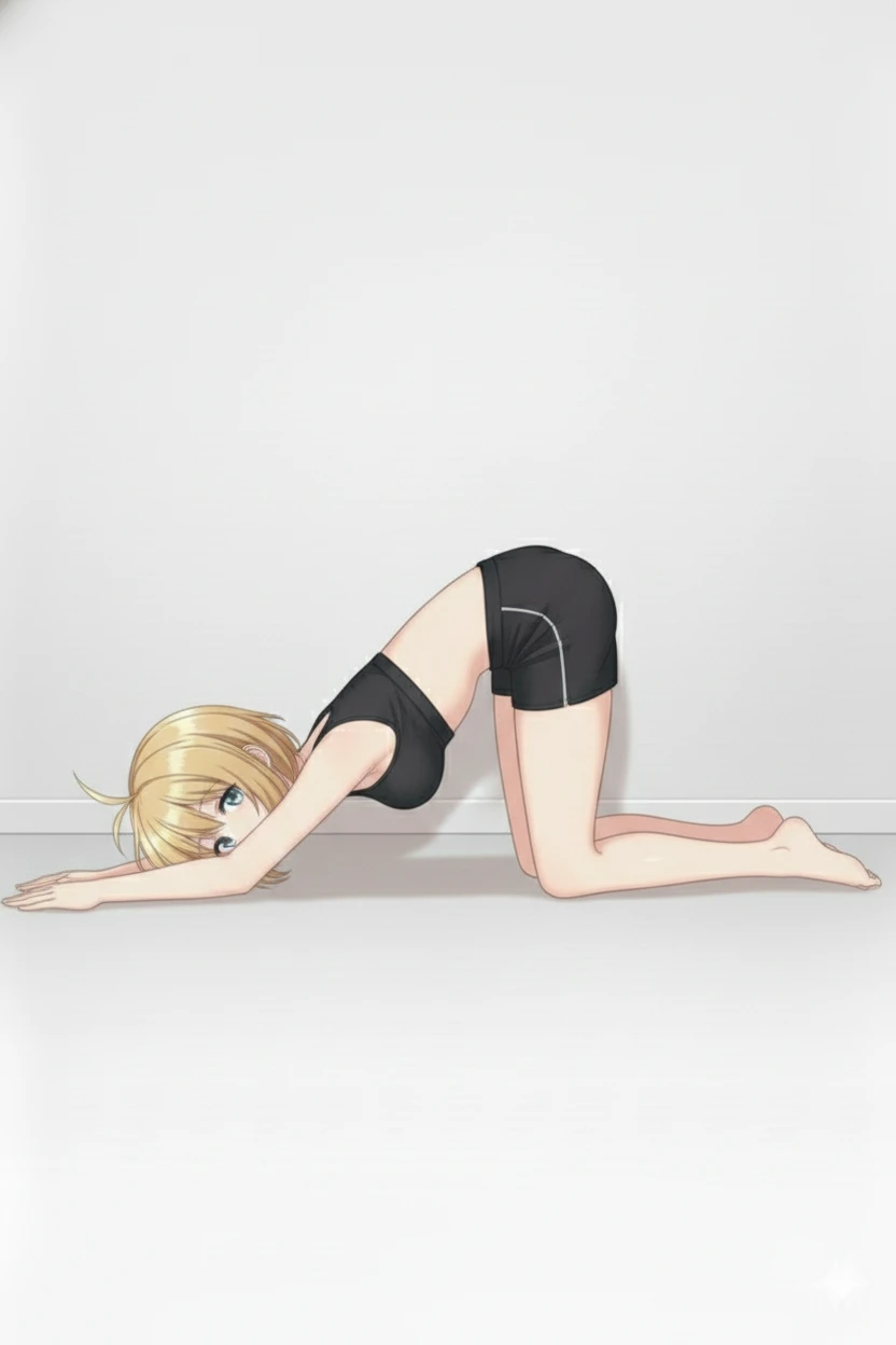 四つん這いの姿勢で、 頭を低くしてヨガのポーズをとるヒカリ。 お尻を突き上げたようなポーズで、どうしてもそちらに目が奪われてしまう。