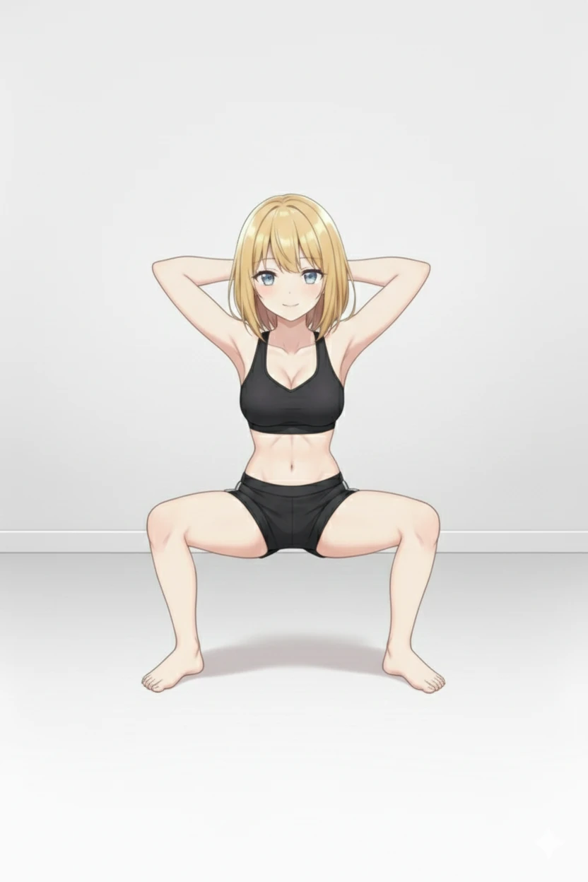 腕を頭の後ろに回して、腰を深く落としたスクワットを始める