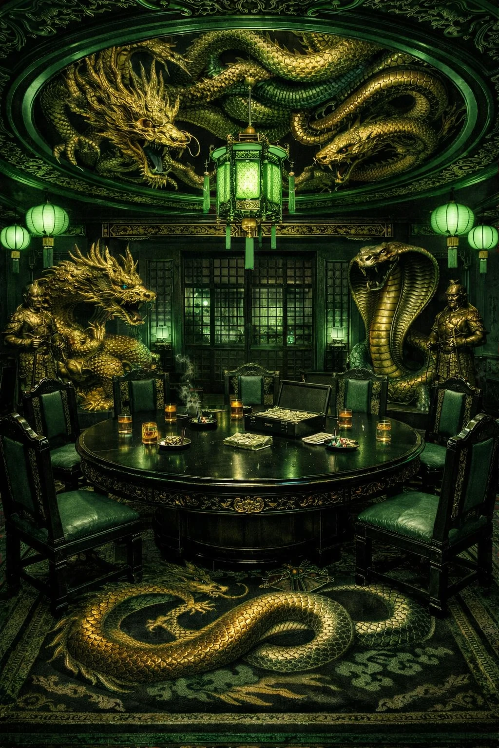 円形のポーカーテーブルを囲むのは、世界を裏から操る者たち 無造作に積まれた高額チップ、札束、そして沈黙。 ここでは、一度の勝敗が国の運命すら揺るがす