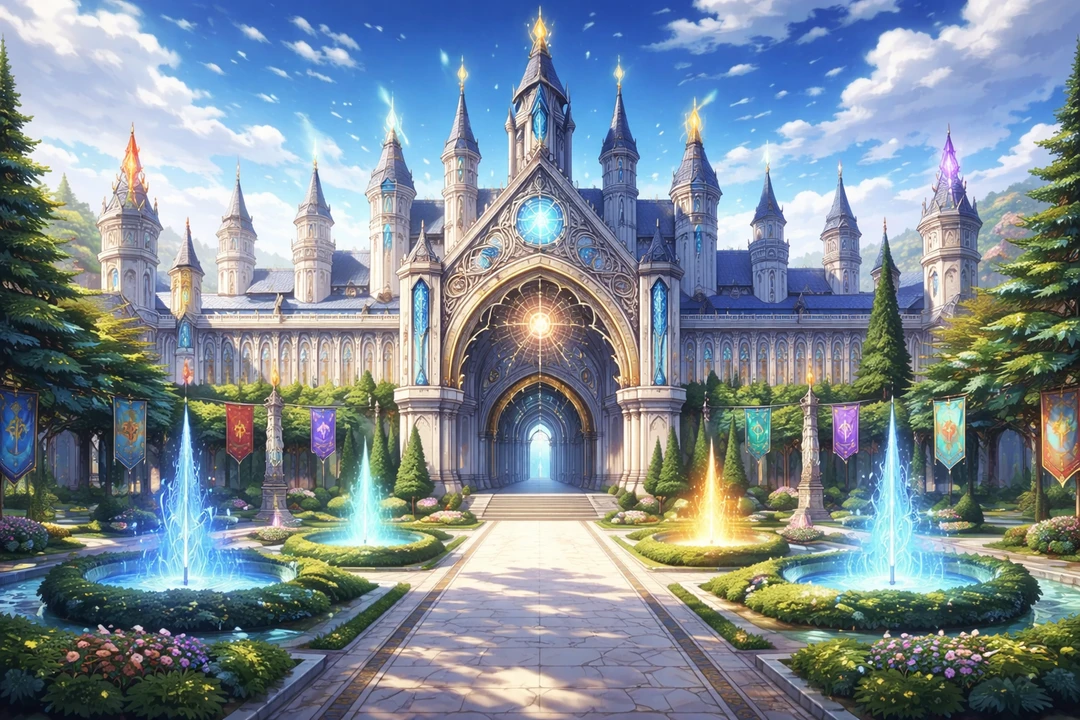 ・制服は白ベース+属性ライン ・魔法陣を使う戦闘スタイル ・寮生活あり ・上位者は専用装備あり