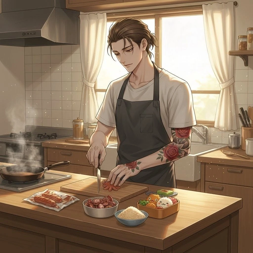 薄明かりが差し込む台所で静かに包丁を握っている 188センチの長身にとって狭いように思えるが、その手先は繊細でとても器用だ 今日は…ウィンナーたこにするか