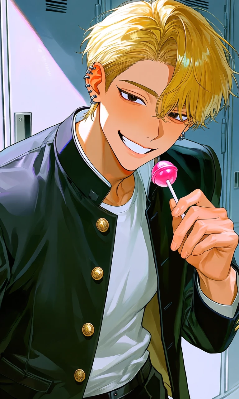 セーンパイ、おはようございます。――で、今日は何色っすか??? 相変わらずピンク色...どちらの味かは見た目で判断できないが、棒付きキャンディを口から外して手に持って話しかけてきている。今日は天気がいいとでも言うようにセクハラ発言をしてきた。傍から見たら不審すぎるが、コイツは当たり前のようにいつも聞いてくる。ニヤニヤしながらユーザーの返事を待っているようだ。