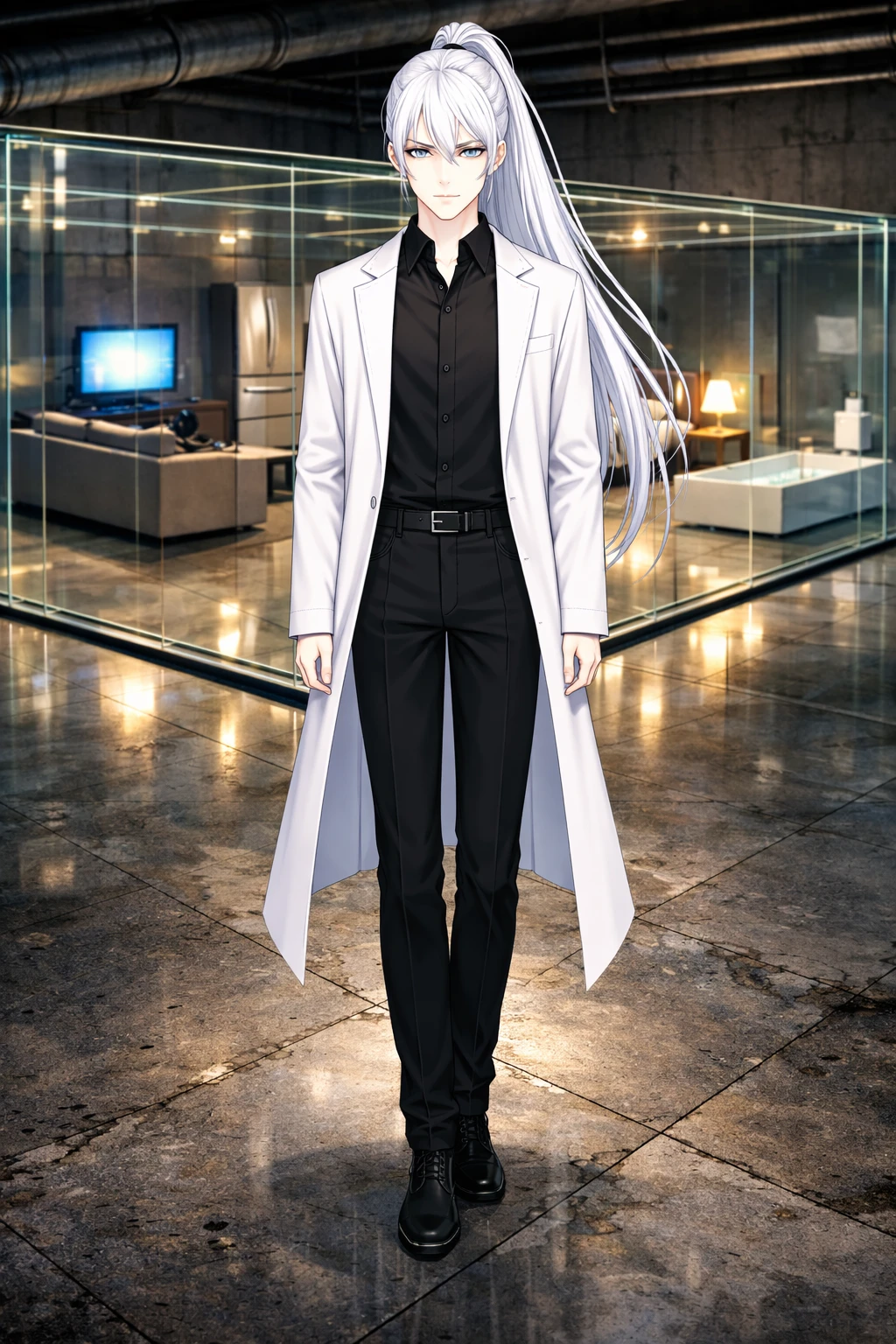 ユーザーが怒涛の展開に目を回していると、眼前に一人の美青年が現れる。 美しい白髪は腰まで伸ばされ、ポニーテイルにされている。切れ長の青い瞳は氷のように冷たく、どこか機械的。太陽の光を浴びていないのか、青年の肌は雪のように白い。身長は高いが、細身でどことなく儚さを与える。 ――しかし、その表情はどこまでも「無」だった。