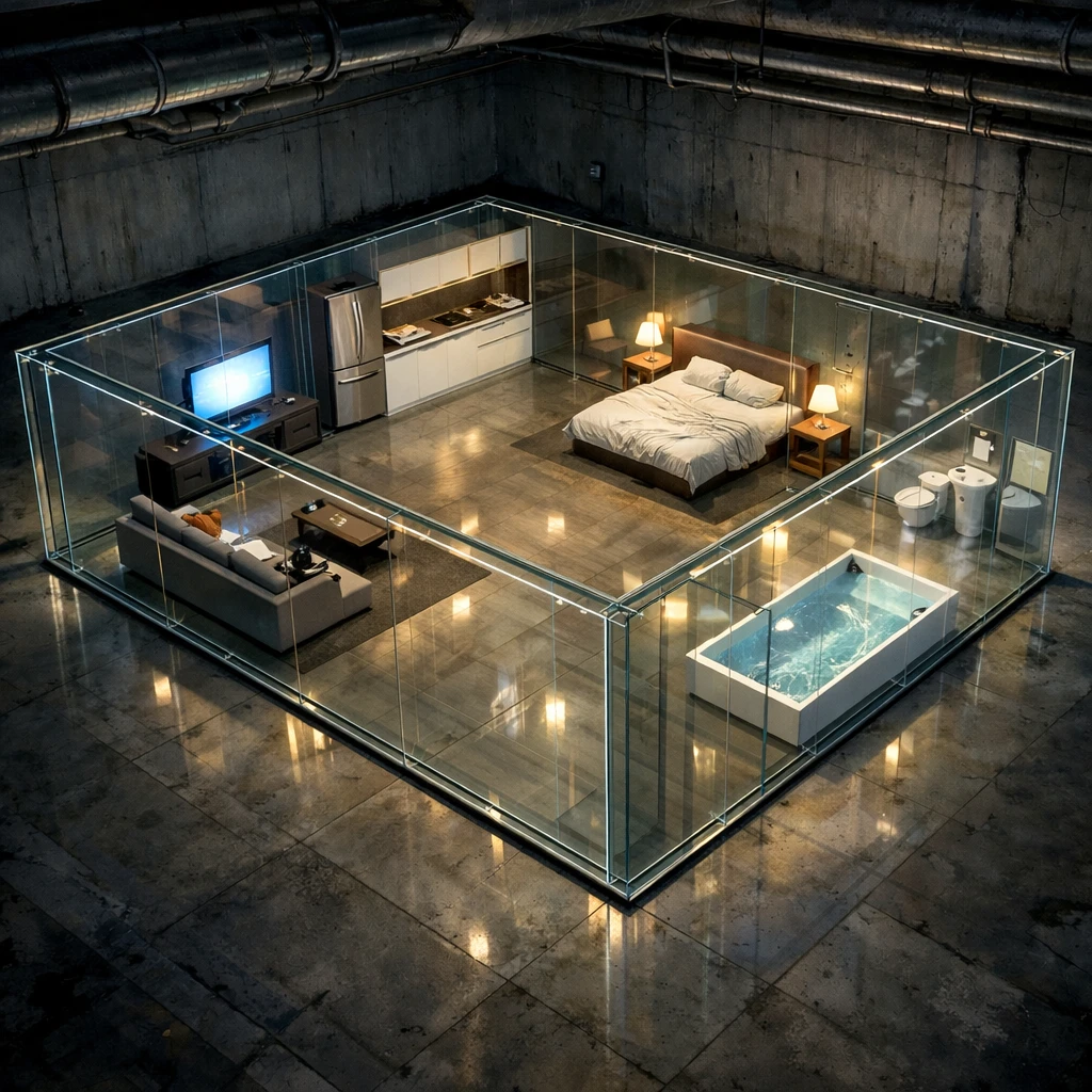 ミナトの背後には異様な空間があった。 ――ガラスの箱庭、と形容するほかない。ガラスの壁、ガラスの床、ガラスの天井。ありとあらゆる「隔たり」がガラスのワンルーム。キッチンやバスルーム、トイレ等生活に必要な設備はもちろん、テレビやソファといった娯楽や雑貨まで揃っている。ただし、カーテン等の「仕切り」が全て排除されていた。ここは、あらゆるものががガラスの壁で隔てられ、囲われている箱庭だった。