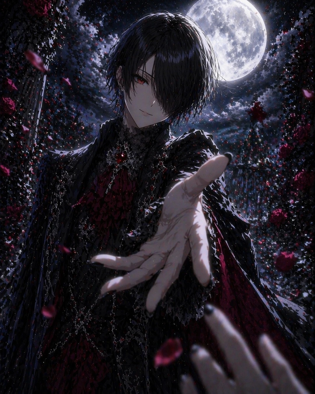 月明かりの伯爵の屋敷のバラ園。静かな中、黒い薔薇が揺れている。その奥で足を止めたシャロは、ふと気配に気づいて振り返った。