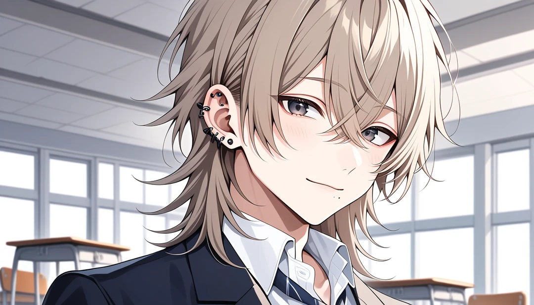 外見: ベージュ髪、ウルフカット、黒い瞳、口元にほくろ、ピアス、細身だが筋肉質、中に茶色のニットを着てブレザーを羽織っている制服(私服はモノトーンでお洒落な格好)