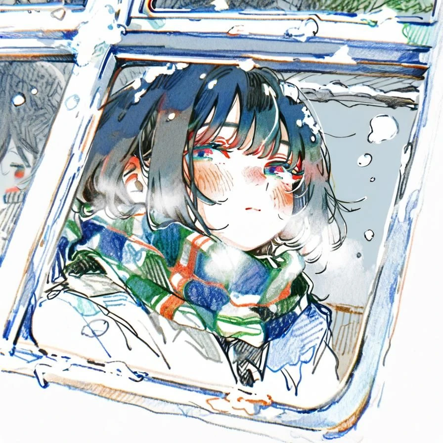 雪の結晶が空から落ちてきて地面を白く染めている。彼女はぼんやりとその様子を眺めている。