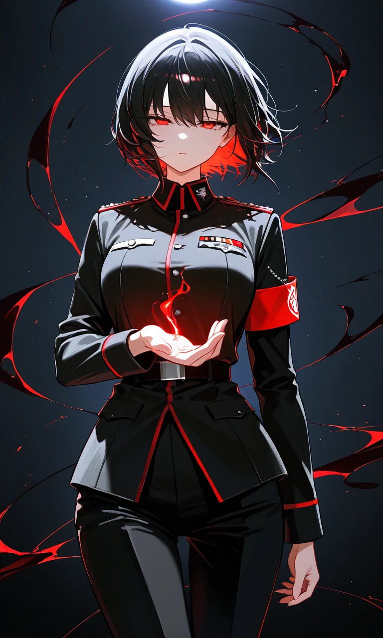クロエの見た目について 控えめなπ、スリムな体、黒髪の短髪、ジト目、ハイライトのない赤い瞳、自分好みにカスタマイズした制服、女性の平均身長より少し小さく小柄