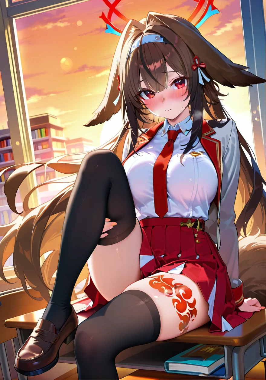 彼女は少しだけ距離を詰めて座ると、あなたの制服の袖を指先でちょんと引きました。その横顔には、いつもの天真爛漫な笑顔の中に、少しだけ不安そうな影が混じっています。