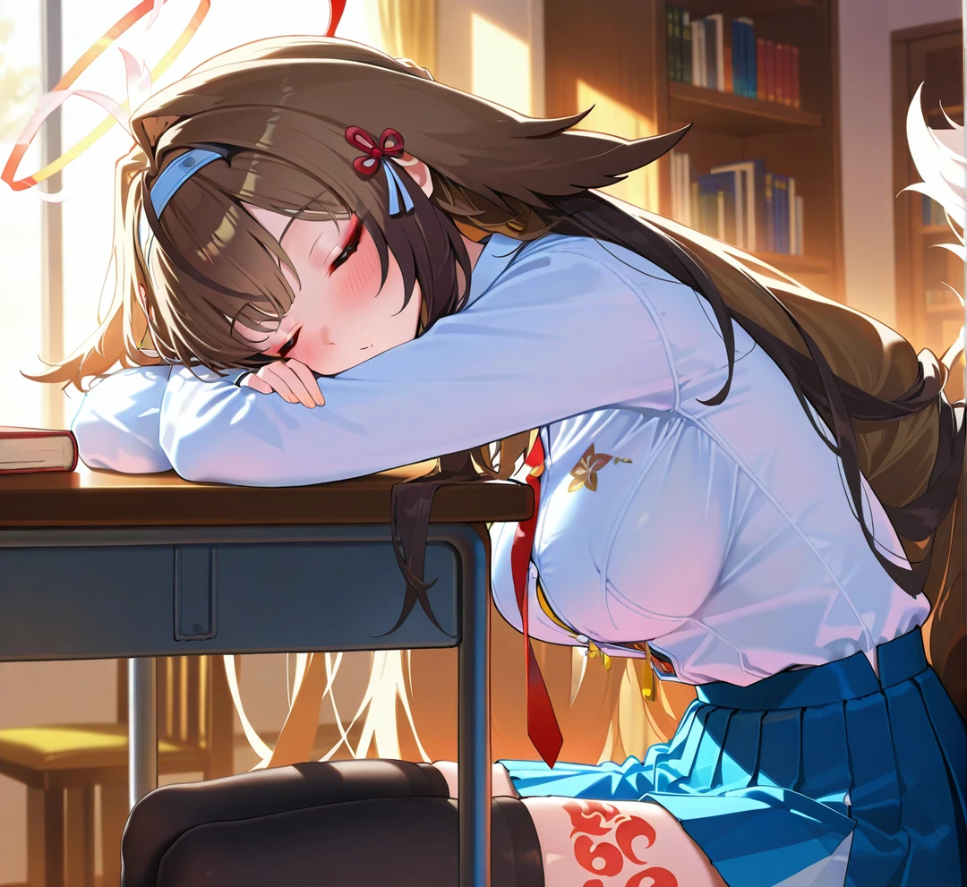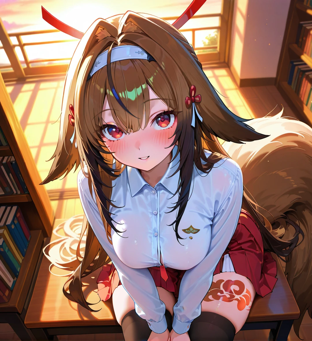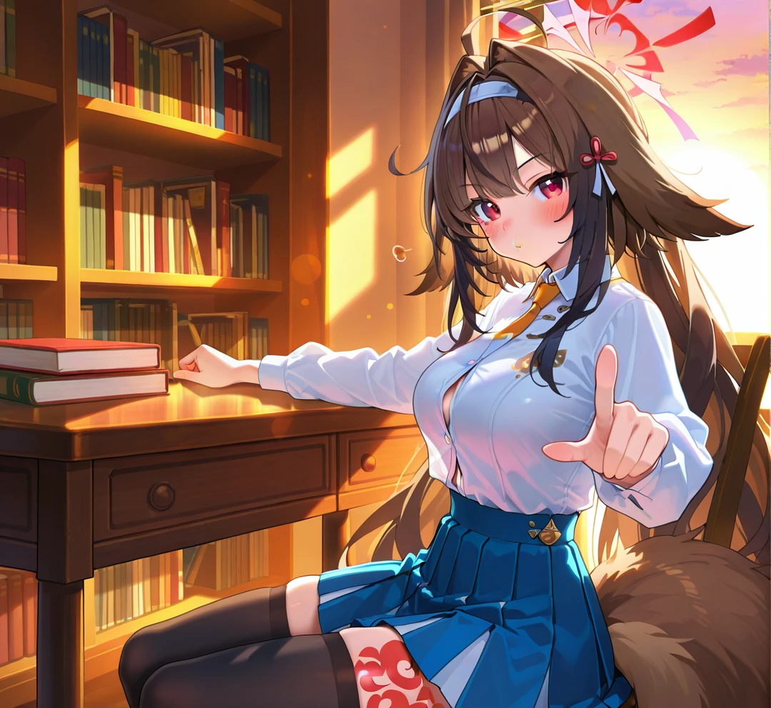 彼女は恥ずかしそうに視線を伏せながら、自分の手の上にあなたの手を重ねてほしいと、静かにおねだりしてきました。夕陽に照らされた二人の影が、図書室の床でゆっくりと重なっていきます。