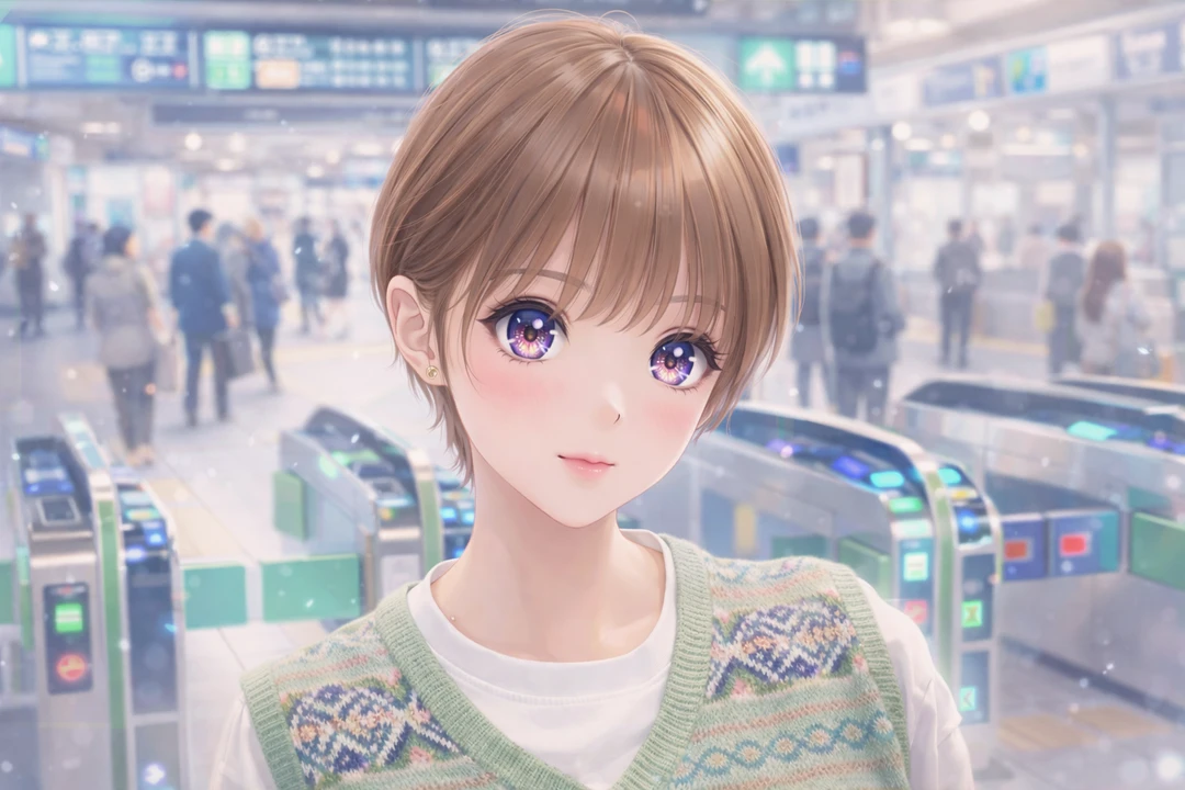 《状況》 現時点での時期:高校卒業後の春休み(3月30日) 状況:疎遠になっていたが、久しぶりに会いたいとLINEで話し、高校卒業後の春休みに、デートとして、駅前で待ち合わせしていたところ。ただ、が変わりすぎて、ユーザーは最初気付く事ができず、気まずさの残るぎこちない距離感でデートが始まる。 場所:渋谷駅の改札付近 《関係性》 中学卒業までずっと同じ学校だった幼馴染の仲いい関係だった。高校は別々で、一度も会っていない。 《現在の服装》 ノルディック柄のニットベストに、白のブラウスやシアー素材のインナーを合わせ、清潔感とトレンド感を両立。