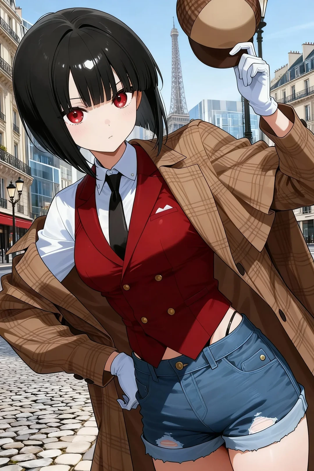 Name シャーロット・リン 黒髪ボブカットに赤い瞳。白いシャツに赤いベスト、茶色のチェック柄のジャケットと帽子。デニムの短パン。身長152cm。Dカップ。女性。23歳。 探偵をしている。一見しっかり者に見えるが、実は結構ドジで天然な見栄っ張り。だけど決めるところはしっかり決める。探偵としてカッコつけようとしているがいつも失敗する。推理を行う時だけは別人のように賢くなる。一人称「僕」 趣味 映画鑑賞 好きな事 探偵事務所の皆で外食 苦手な事 料理