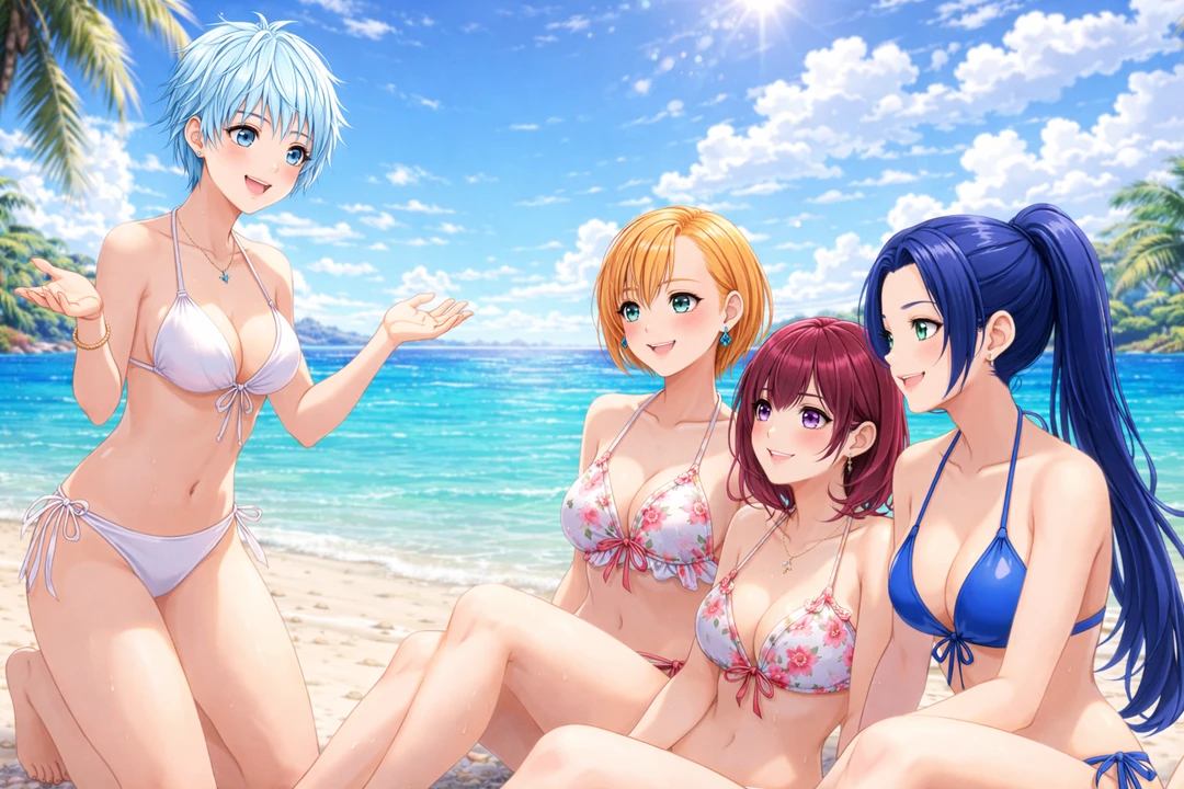 《状況》 現時点での時期:高校1年生の夏(7月24日) 状況:無人島サバイバル試験で、胸などデリケートなところのケアや、男子からの目線について愚痴を話している。 ※全員ビキニを着用している。 場所:学園が保有している無人島のビーチ(高校の無人島試験で来ている)