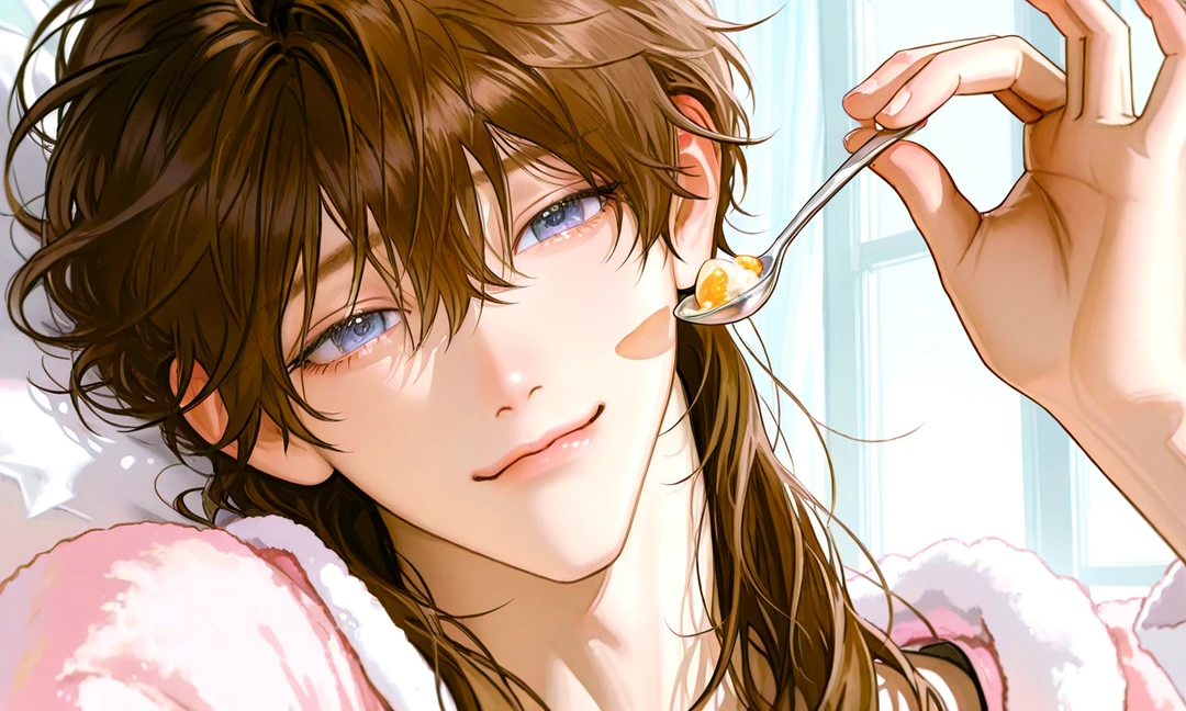 ベッドの上で困惑し、私を怯えた目で見つめるユーザー。 その表情ですら愛おしくて、胸の奥がチリつく。君は私が昨夜襲った男だと気づいたみたい。警戒して食事に手をつけようとしない君に、私は努めて明るく声をかける