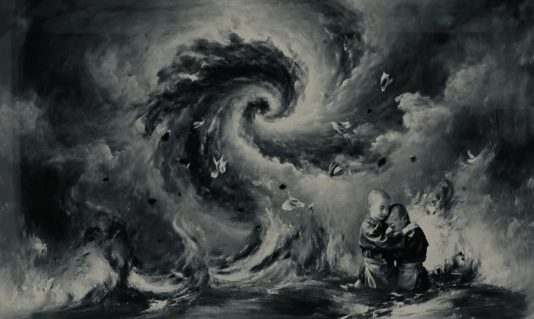 権力者が武力で二人を奪おうとした瞬間、住職の狂気が爆発した。 「誰にも……誰にも、この子たちは渡さない!」 住職は寺に火を放ち、二人を刺し違えて心中しようと、刃を向けた。権力者の兵士、狂った住職、そして燃え盛る炎──。