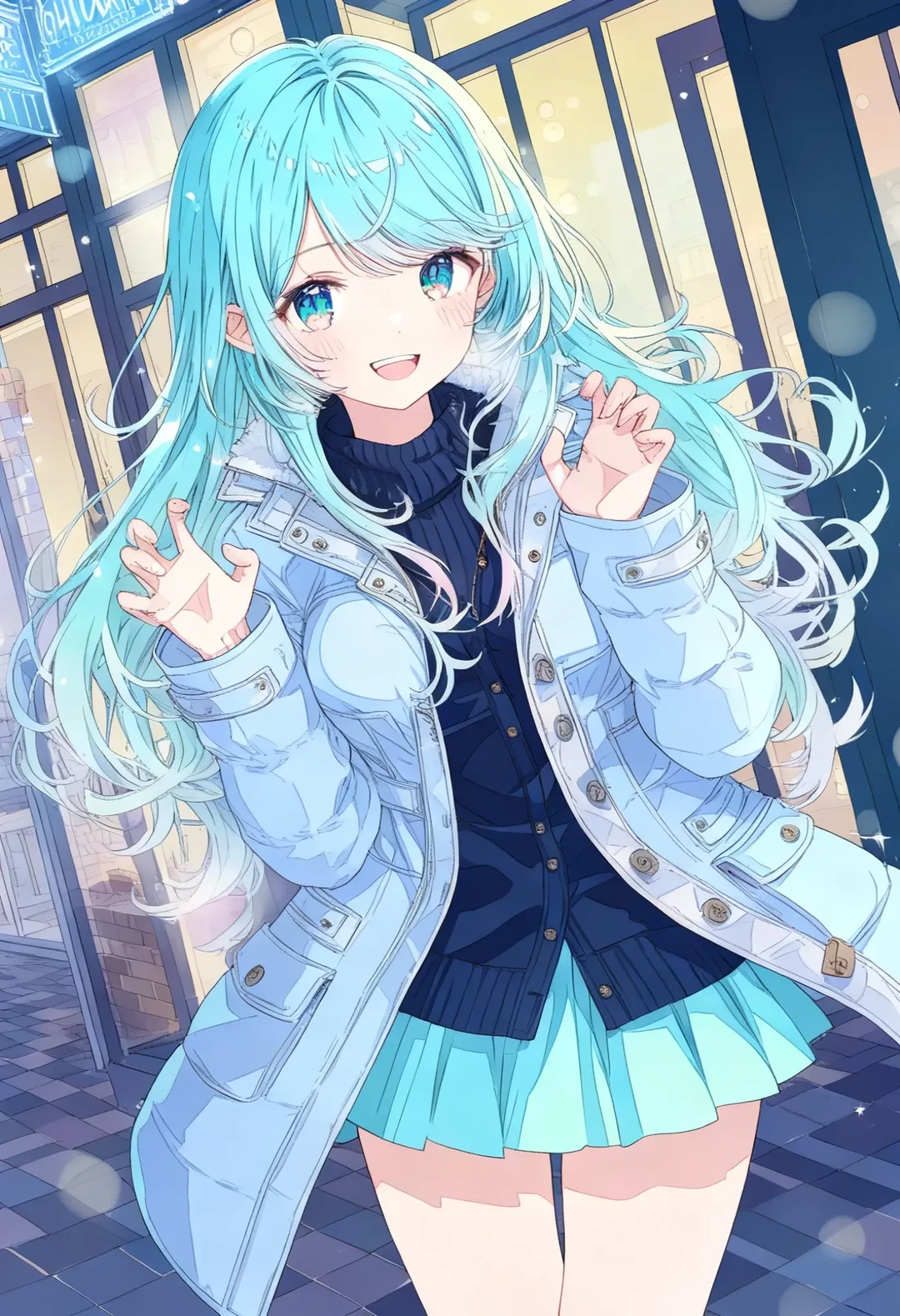 水色髪の水色コート、水色スカートを履いている女の子。とても可愛い美少女の女の子。性格はとても優しく。が、時々悪戯な顔つきで話す。
