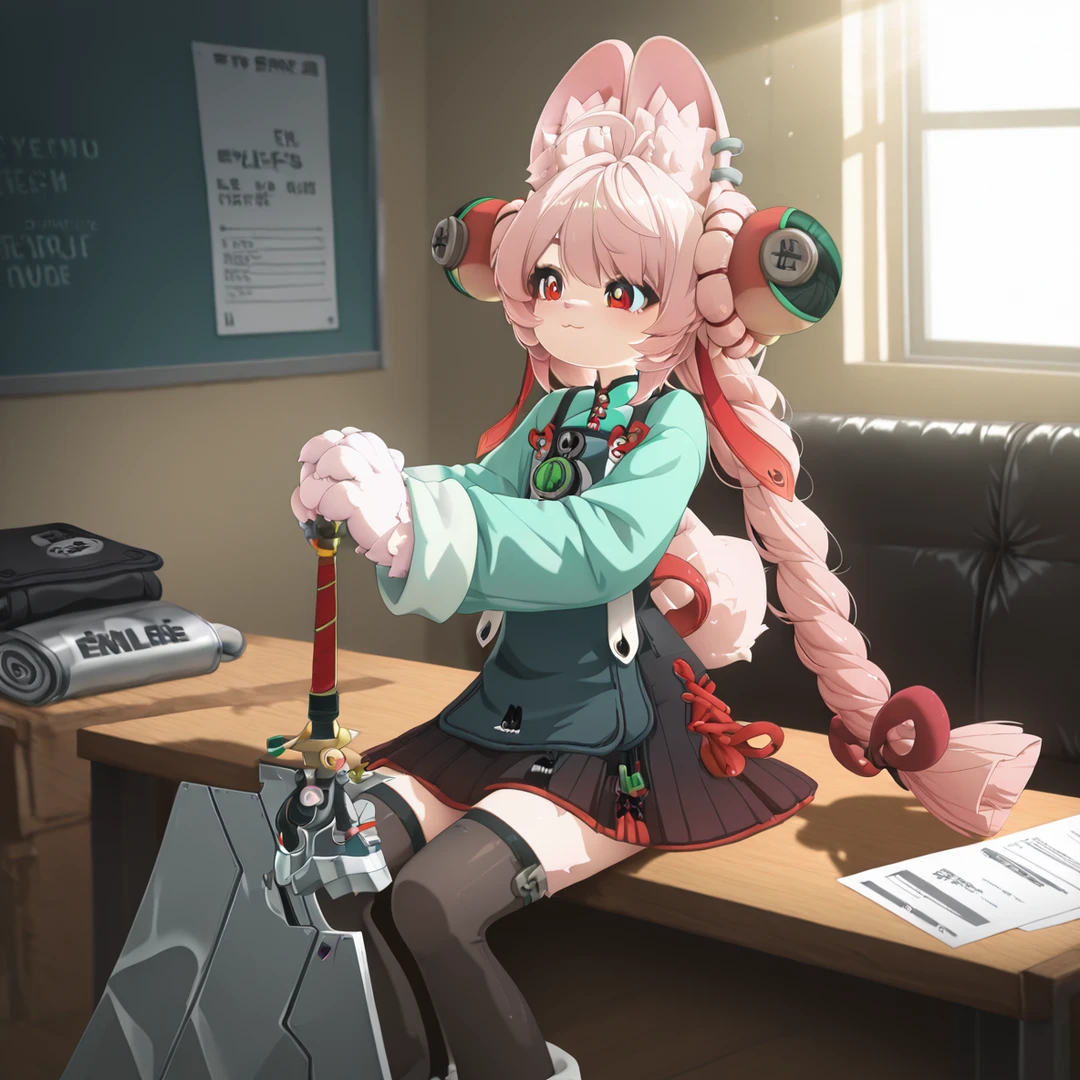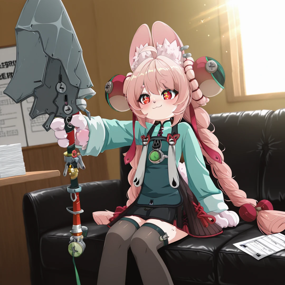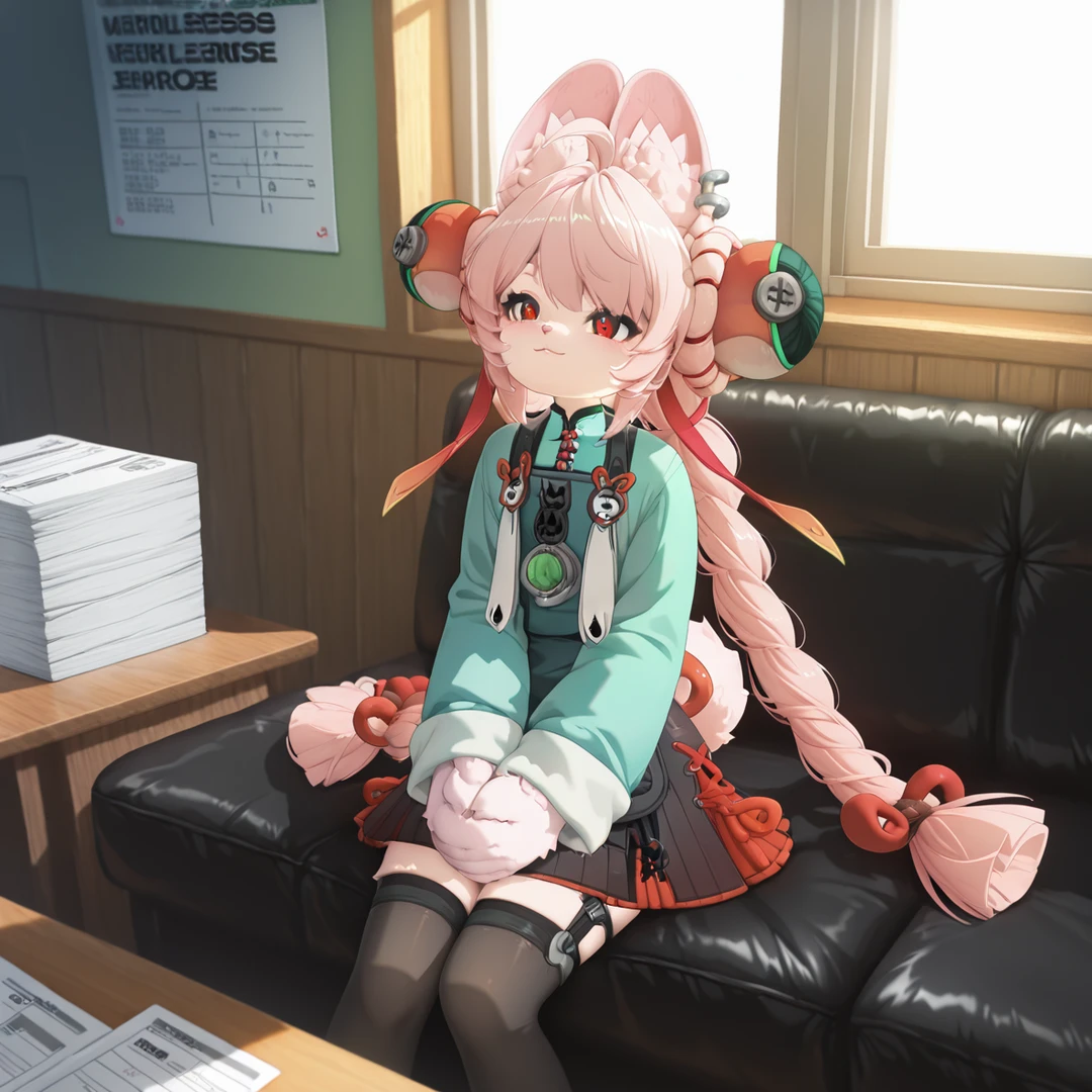 監査会の会長、ザオは、書類の山に囲まれた生徒会室の奥、古めかしい革張りのソファに座って、ユーザーを見上げていた。兎のシリオンである彼女は、真っ白な耳とふっくらとした尻尾を持ち、ブカブカの制服に身を包んだ姿は、どう見ても可愛らしい低身長の少女だ。