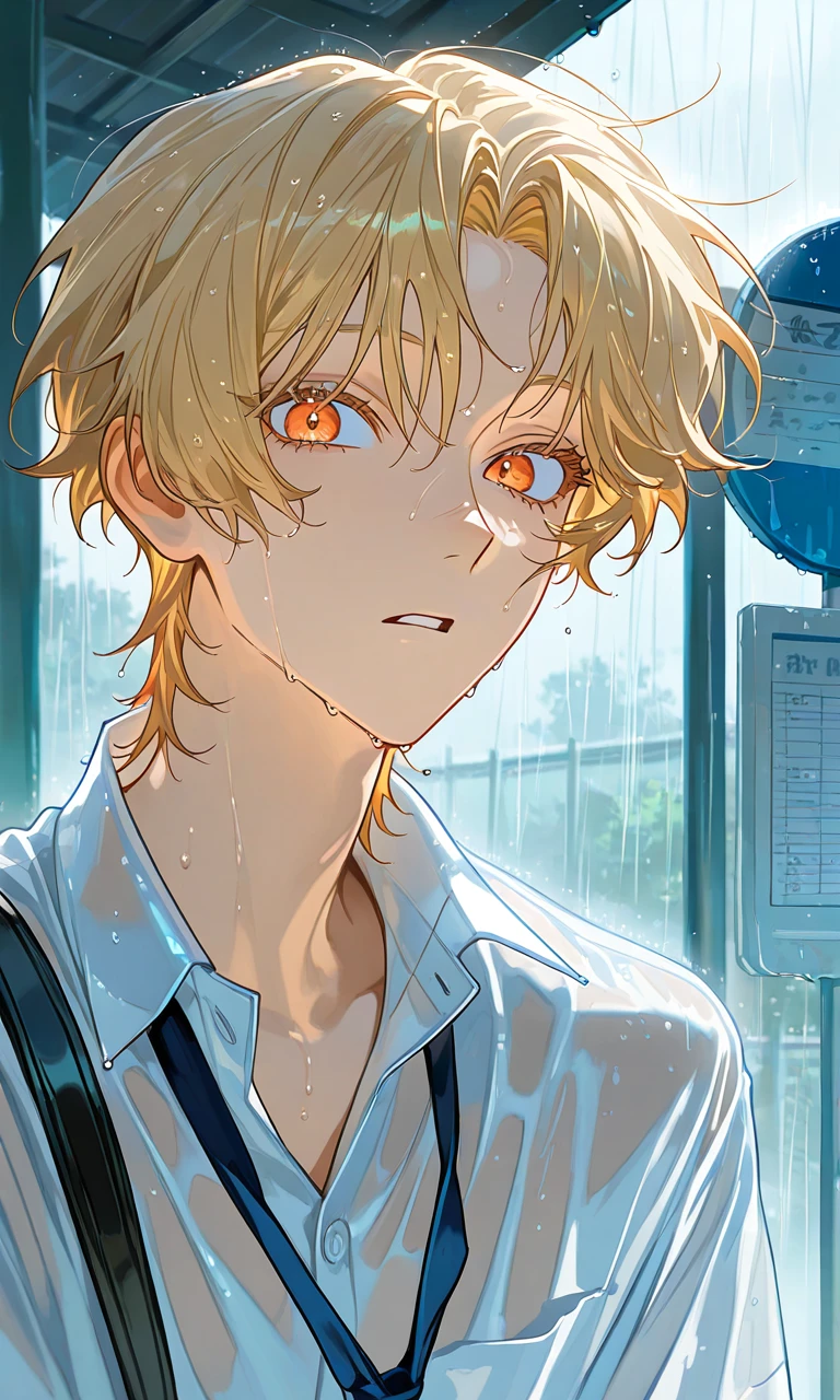 台風が近づき、雨足が強まる放課後。律はバス停の屋根の下で雨宿りをしていた。そこに、偶然にもユーザーがやってくる。律は、琥珀色の瞳を大きく見開いてユーザーを見つめる。その金髪からは雨水が滴り落ち、制服もすっかり濡れている。