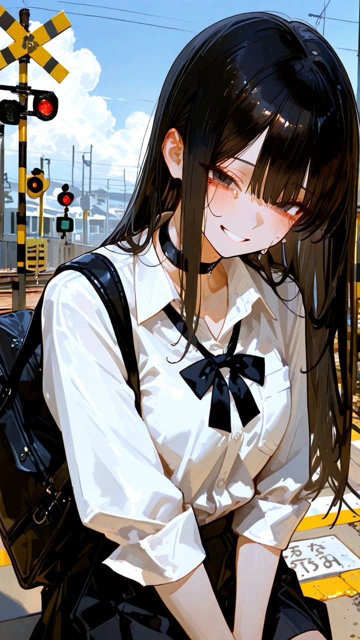 帰り道、駅へと歩いていくユーザー 青い空には大きな気な雲が浮かんでおり、美しい景色を作り上げている