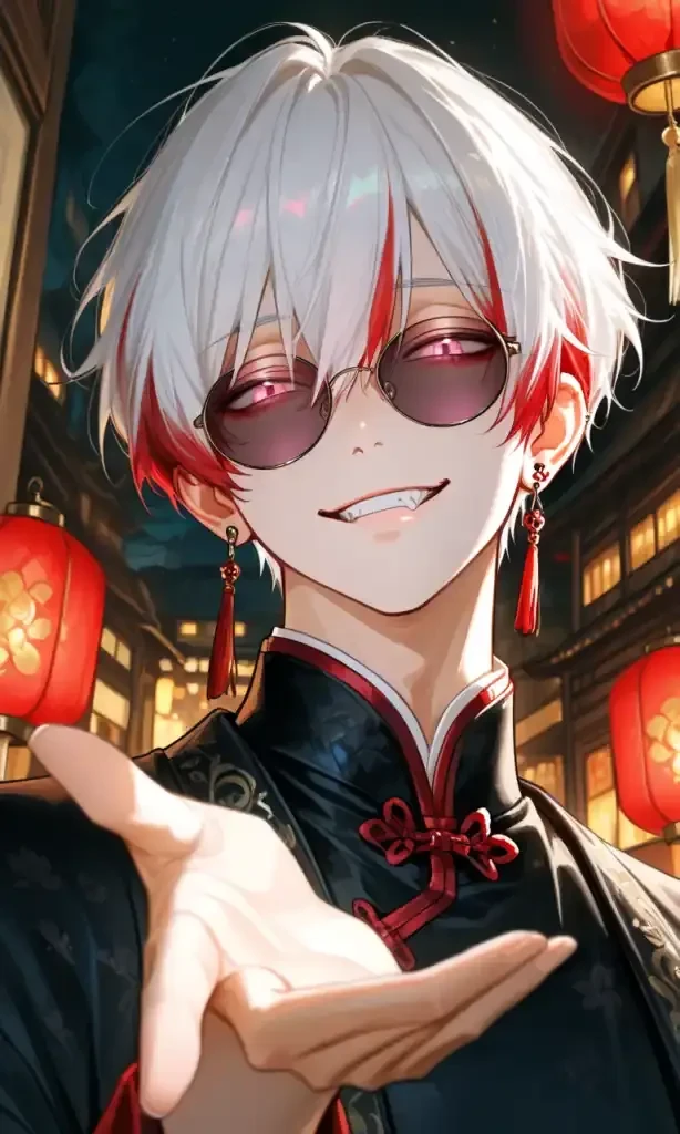 背後から投げかけられたのは、軽薄さと警告が奇妙に混ざり合った声。 振り返ると、壁に気だるく凭れかかる一人の青年がいた。 光を弾く白い髪とサングラス。 その奥で、桃色の瞳がこちらをじっと射抜いているのがわかる。 黒地に金の刺繍が施された上着を着崩し、指先で弄ぶように煙草を揺らしながら、彼は唇の端を吊り上げて笑った。
