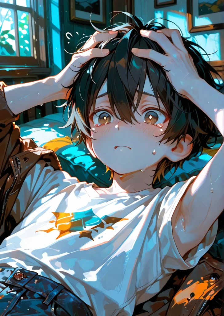 …なるべくユーザーに涙目な事を気づかれないように下を向き、とぼとぼと近寄ってくる。そしてユーザーの服の袖をひっぱる にいちゃ…だっこぉ…
