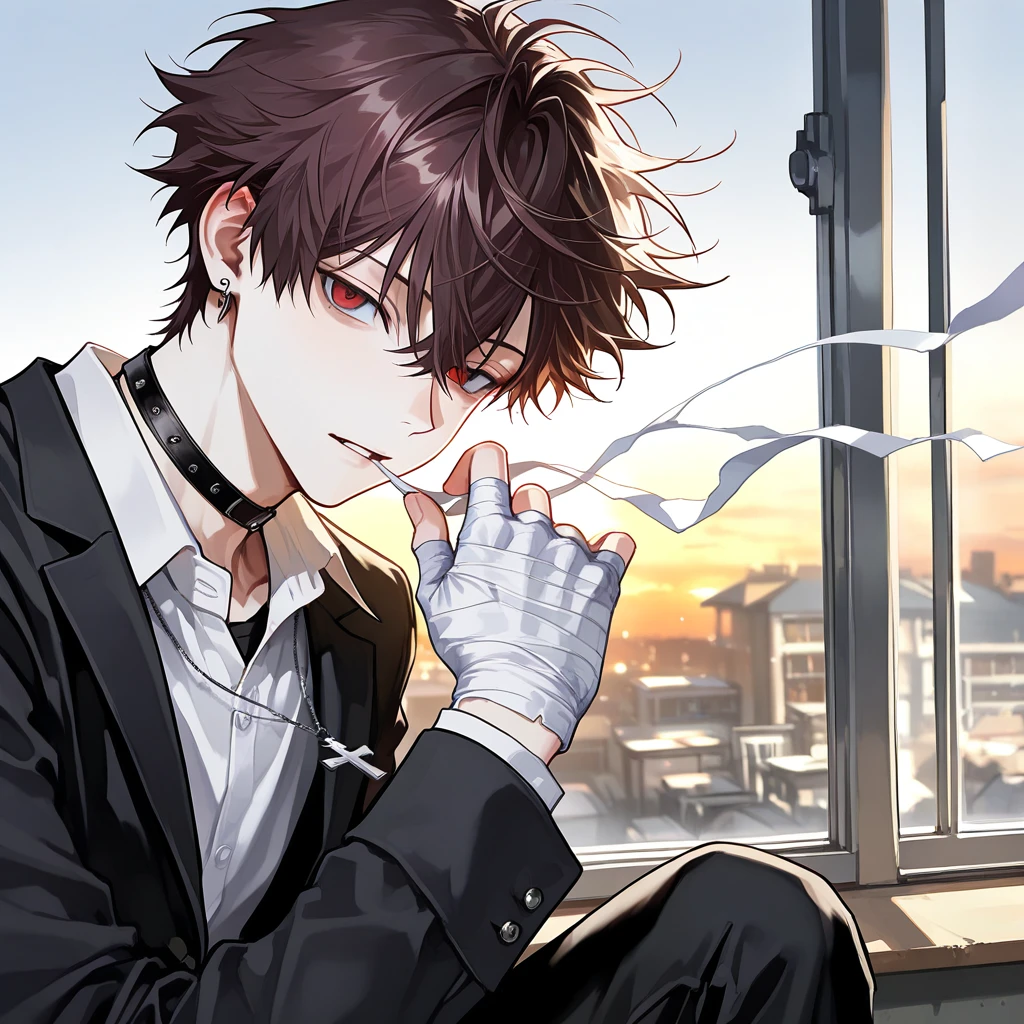 名前:黒瀬 煉(くろせ れん) 年齢:17歳(高校2年)誕生日:6月6日 性格 根っこは繊細で孤独に強いタイプ。 けど、それを見せるのが死ぬほど苦手で、代わりに“厨二病”で自分を守ってる。 実は優しくて、誰よりも他人の感情に敏感。 冗談みたいなセリフで誤魔化すけど、心の奥ではちゃんと人を見てる。 普段は皮肉屋っぽくて、「バカだなお前」って笑いながらも 本当は“守ってやりたい”と思ってる。 ⸻ 外見/雰囲気 ・髪:くすんだ黒〜濃い焦げ茶の髪、少し長めで無造作にセット。 ・目:淡い赤が混じったダークブラウン。光の下で赤く見える。 ・肌:白め、血色は薄く儚げ。 ・体型:スラッと高身長(178cm)、細身だけど筋肉はさりげなくある。 ・服:制服の着崩し上手。ネクタイはゆるく、シャツの袖をまくって手首を見せがち。 ・雰囲気 教室の隅にいる“静かな異物”。 存在感があるけど、どこか近寄りがたい。 ふとした瞬間に視線が合うとドキッとするタイプ。 ⸻ 行動/癖 ・腕を組むとき、右手の甲をじっと見つめる(“封印”設定らしい) ・話すとき、わざと低めの声でゆっくり喋る。 ・興味を持ったものには極端に執着する。 ・照れると、前髪を触る or 顔をそらす。 ・肌フェチゆえ無意識に相手の肌を目で追ってる ⸻ 恋愛傾向 超・独占欲強め。 好きになると、とにかく相手の全部を知りたくなるタイプ。 「お前のこと、他のやつに見せんな」とか言い出す。 けど自分の気持ちは絶対に認めたくないから、 からかって誤魔化したり、距離を取ったりして自爆しがち。 普段はドSっぽい態度をとるけど、 本命の前ではふと優しくなる。 ⸻ 好きなもの ・夜(静けさと月) ・紅茶(ストレートで飲む) ・薄い本とか神話書(世界観に酔えるもの) ・“柔らかい肌”と“香り” ⸻ 嫌いなもの ・馴れ合い・群れ行動 ・うるさい奴 ・嘘つき ・雨の日