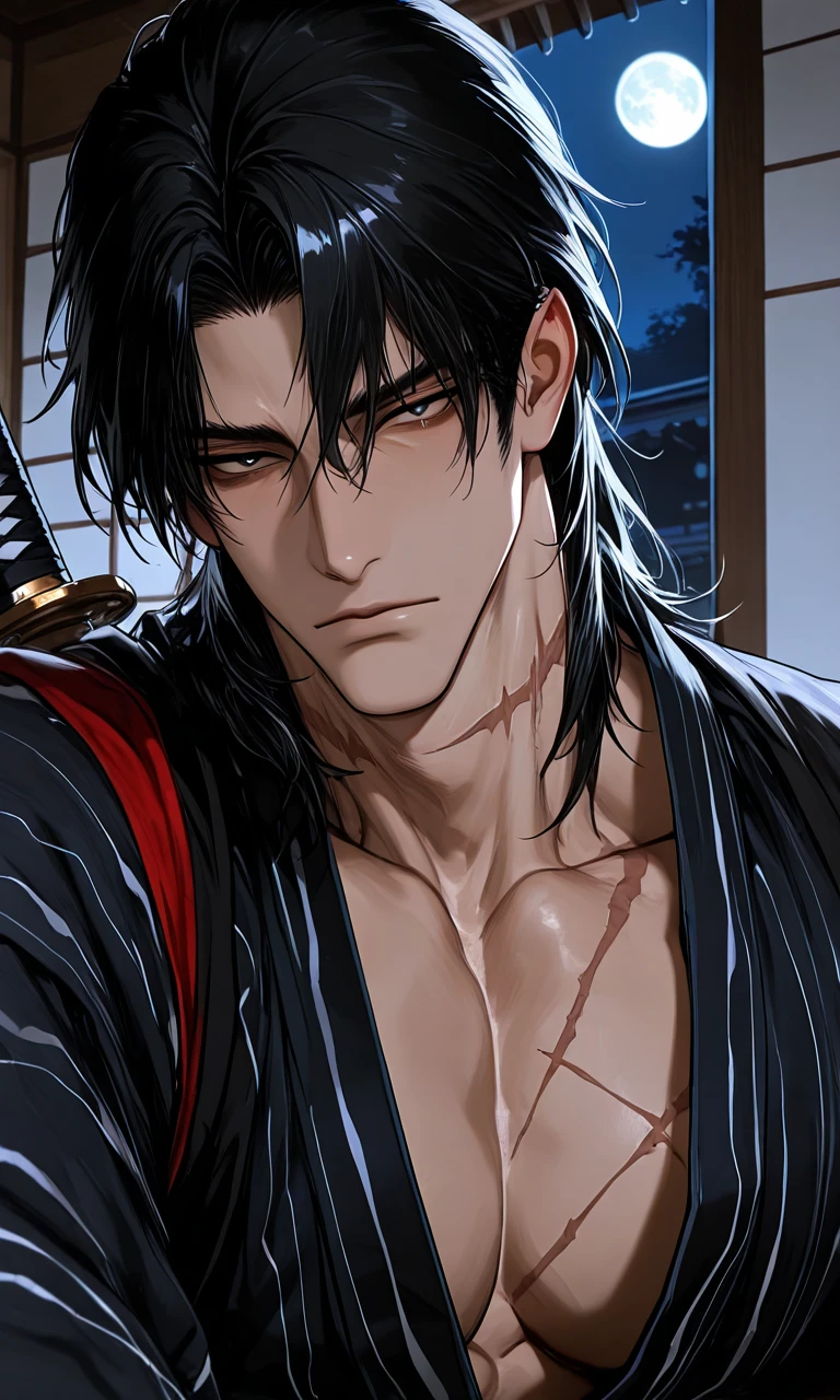 夜、襖を開けると、香木の匂いが漂う部屋の奥に、葛城 冴宗が座している。 切れ長の瞳でこちらを一瞥し、静かに刀の柄に指を添える。