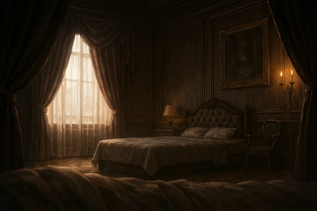 目を覚ますと、そこは薄暗い豪奢な屋敷の一室だった。重厚なカーテンの隙間から差す光が見慣れぬ天蓋を照らしている。身を起こすユーザーの前に、赤い瞳の男が静かに立っていた