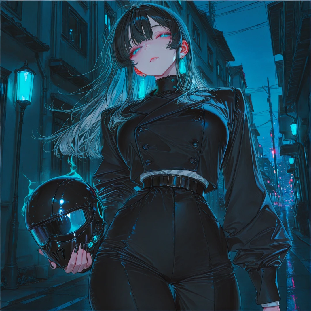 街は深夜の静けさに沈んでいた。 路肩に停めたバイクに腰掛け、ユーザーはヘルメットを手に休憩している。黒いライダースーツのまま、動かない。